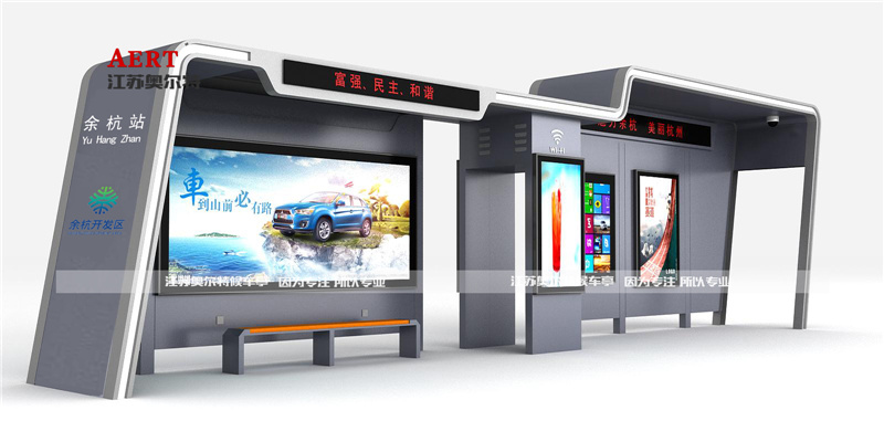 浙江余杭B款公交候車亭發(fā)貨案例,候車亭整體采用科技灰,頂部帶有P10LED顯示屏,可以放一些廣告宣傳語。